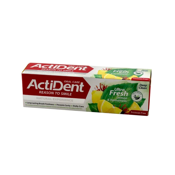 خمیردندان اکتیدنت- الترافرش حاوی عصاره لیمو و هاماملیس با ویژگی ضدپوسیدگی خنک کنندگی 100گرمی